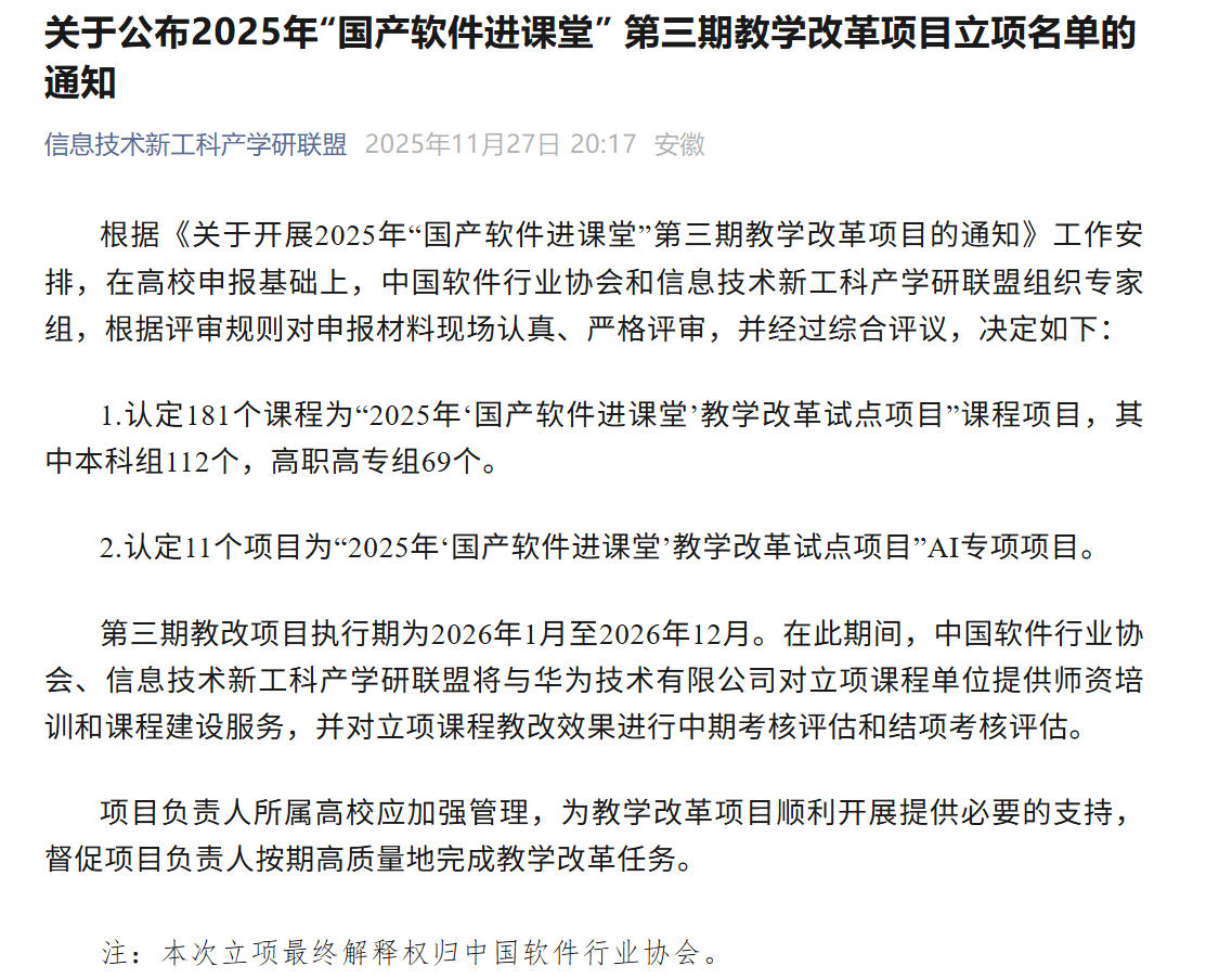 为全面贯彻党的二十大精神,落实教育部等五部门《普通高等教育学科专业设置调整优化改革方案》要求,推进高等教育高质量发展,中国软件行业协会、信息技术新工科产学研联盟联合开展“国产软件进课堂”教学改革项目,旨在推动国产自主软件技术和工具进课堂,创新产教融合模式,促进高校新型ICT专业建设改革与实践。第三期项目自2025年11月启动申报以来,得到全国各高校积极响应,经专家组严格评审,最终认定181个课程项目为教学改革试点项目,其中高职高专组项目69个。
